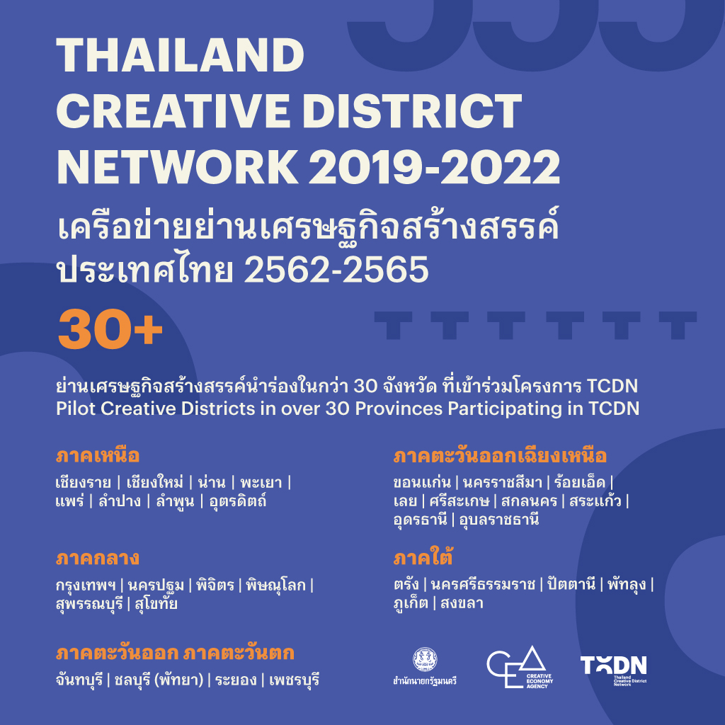 เครือข่ายย่านเศรษฐกิจสร้างสรรค์ประเทศไทย หรือ Thailand Creative District Network (TCDN) คือ ช่องทางสนับสนุนให้ตัวแทนพื้นที่จากทุกจังหวัดที่มีความพร้อมและต้องการพัฒนาย่านของตน ได้รับความร่วมมือจากผู้เชี่ยวชาญด้านการพัฒนาเมืองทุกภาคส่วน เพื่อช่วยกันค้นหา พัฒนา และต่อยอดสินทรัพย์ในท้องถิ่น ปลุกปั้นให้พื้นที่นั้นๆ ก้าวสู่การเป็น “พื้นที่เศรษฐกิจสร้างสรรค์” ที่สามารถยกระดับคุณภาพชีวิตของผู้คนได้อย่างยั่งยืน