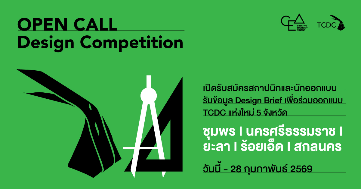 สำนักงานส่งเสริมเศรษฐกิจสร้างสรรค์ (องค์การมหาชน) หรือ CEA เปิดรับสมัคร “สถาปนิกและนักออกแบบ” ที่สนใจเข้าร่วมรับฟัง Design Brief และส่งผลงานเข้าร่วมการประกวดออกแบบพื้นที่ศูนย์สร้างสรรค์งานออกแบบ (TCDC) แห่งใหม่ใน 5 จังหวัด เพื่อต่อยอดศักยภาพพื้นที่สร้างสรรค์ของเมือง และขับเคลื่อนเศรษฐกิจสร้างสรรค์ฐานรากอย่างยั่งยืน