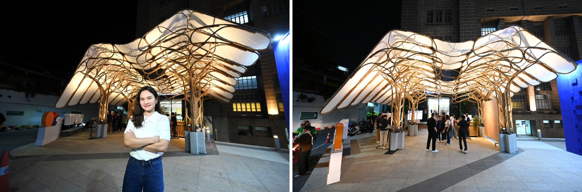 ซึ่งปีนี้เรามุ่งขยายภาพลักษณ์ของ Tyvek® จากวัสดุเฉพาะทางในภาคอุตสาหกรรม สู่การเป็นวัสดุทางเลือกในงานสถาปัตยกรรมและงานคราฟต์ไทย โดยสะท้อนบทบาทของการออกแบบในฐานะตัวเร่งนวัตกรรม (Design - driven Innovation) ที่ช่วยขยายขอบเขตการใช้งานของวัสดุอุตสาหกรรม ไปสู่กลุ่มนักออกแบบ สถาปนิก และโครงการระดับนานาชาติ ผ่านงานสถาปัตยกรรมที่ผสานงานฝีมือเข้ากับเทคโนโลยีดิจิทัลอย่างลงตัว ซึ่งผลงาน ‘ส่อง สาย สาน’ ได้นำวัสดุจาก Tyvek® ที่ใช้เส้นใย โพลีเอทิลีน (HDPE) คุณภาพสูงที่มีความเหนียว ทนทาน และกันน้ำ มาขึ้นรูปเป็นหลังคา ผสมผสานกับโครงสร้างหวายดัดด้วยไอน้ำ ซึ่งต้องอาศัยทักษะช่างฝีมือควบคู่กับความแม่นยำของเทคโนโลยี Mix Reality อย่างแว่นตา Hololens ที่ไม่เพียงสร้างความแตกต่างให้กับผลงาน แต่ยังเปิดโอกาสใหม่ในการต่อยอดสู่โครงการระดับสากลในอนาคต”