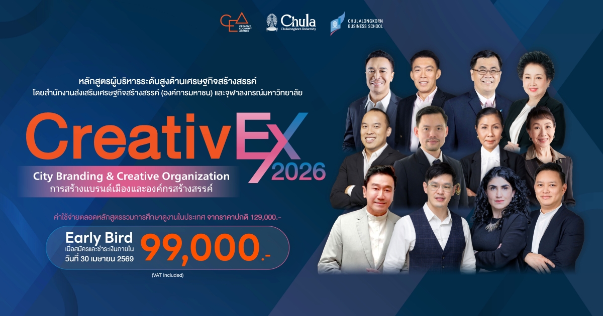 กรุงเทพฯ – ท่ามกลางพลวัตของเศรษฐกิจโลกที่เปลี่ยนแปลงอย่างฉับพลัน ‘ความคิดสร้างสรรค์’ กลายเป็นขุมพลังหลักในการสร้างความได้เปรียบทางการแข่งขัน สำนักงานส่งเสริมเศรษฐกิจสร้างสรรค์ (องค์การมหาชน) หรือ CEA ตอกย้ำพันธกิจหลักในการขับเคลื่อนเศรษฐกิจประเทศผ่านทุนทางวัฒนธรรมและนวัตกรรม สานต่อความร่วมมือกับ คณะพาณิชยศาสตร์และการบัญชี จุฬาลงกรณ์มหาวิทยาลัย (CBS) เปิดรับสมัคร “หลักสูตรผู้บริหารระดับสูงด้านเศรษฐกิจสร้างสรรค์ ประจำปี 2569 (CreativEX 2026: City Branding & Creative Organization)” ต่อเนื่องเป็นปีที่ 2 มุ่งพัฒนาศักยภาพผู้นำวิสัยทัศน์ใหม่ให้พร้อมใช้ความคิดสร้างสรรค์เป็นอาวุธเชิงกลยุทธ์ เพื่อยกระดับขีดความสามารถในการแข่งขันขององค์กร เมือง และประเทศไทยในบริบทเศรษฐกิจโลกยุคใหม่ โดยเปิดรับสมัครพร้อมรับสิทธิพิเศษ Early Bird ถึงวันที่ 30 เมษายน 2569