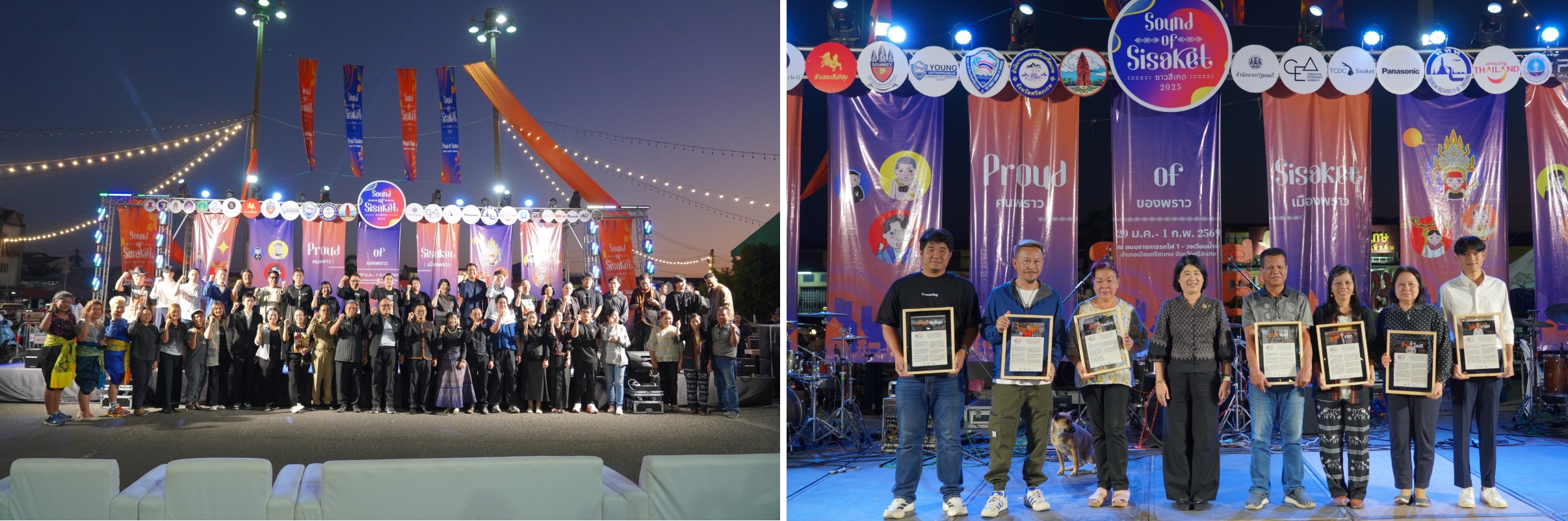 สำนักงานส่งเสริมเศรษฐกิจสร้างสรรค์ (องค์การมหาชน) หรือ CEA จังหวัดศรีสะเกษ เทศบาลเมืองศรีสะเกษ หอการค้าจังหวัดศรีสะเกษ การท่องเที่ยวแห่งประเทศไทย สำนักงานสุรินทร์ - ศรีสะเกษ พร้อมด้วยภาคีเครือข่ายหน่วยงานภาครัฐและเอกชน สถาบันการศึกษา ศิลปิน นักสร้างสรรค์ และผู้สนับสนุน ร่วมจัดพิธีแสดงวิสัยทัศน์การจัดเทศกาล “Sound of Sisaket 2025: ซาวสีเกด 2568” เพื่อขับเคลื่อนศรีสะเกษสู่การเป็นเครือข่ายสมาชิกเมืองสร้างสรรค์ขององค์การยูเนสโกด้านดนตรี (UNESCO Creative Cities Network: UCCN) โดยได้รับเกียรติจากคุณกันวลินทร์ เมืองแก้ว นายอำเภอจังหวัดศรีสะเกษ เป็นประธาน พร้อมด้วยคุณคมสัน เพิ่มบุญ รองนายกเทศมนตรีเมืองศรีสะเกษ ดร. รัฐวิทย์ อังคสกุลเกียรติ ประธานหอการค้าจังหวัดศรีสะเกษ คุณสุมาลี มณีไมตรีจิต รองผู้อำนวยการการท่องเที่ยวแห่งประเทศไทย สำนักงานสุรินทร์ - ศรีสะเกษ คุณชมภารี ชมภูรัตน์ รองปลัดกระทรวงดิจิทัลเพื่อเศรษฐกิจและสังคม คุณธนพล ภู่พันธ์ศรี กรรมการผู้ทรงคุณวุฒิสำนักงานส่งเสริมเศรษฐกิจสร้างสรรค์ และคุณพันธิตรา สินพิบูลย์ ผู้อำนวยการสำนักภาคกลางและกรุงเทพมหานคร สำนักงานส่งเสริมเศรษฐกิจสร้างสรรค์ ร่วมในพิธี เมื่อวันที่ 1 กุมภาพันธ์ 2569 ณ เวทีกลาง ย่านวงเวียนแม่ศรี ถนนราชการรถไฟ 1 จังหวัดศรีสะเกษ