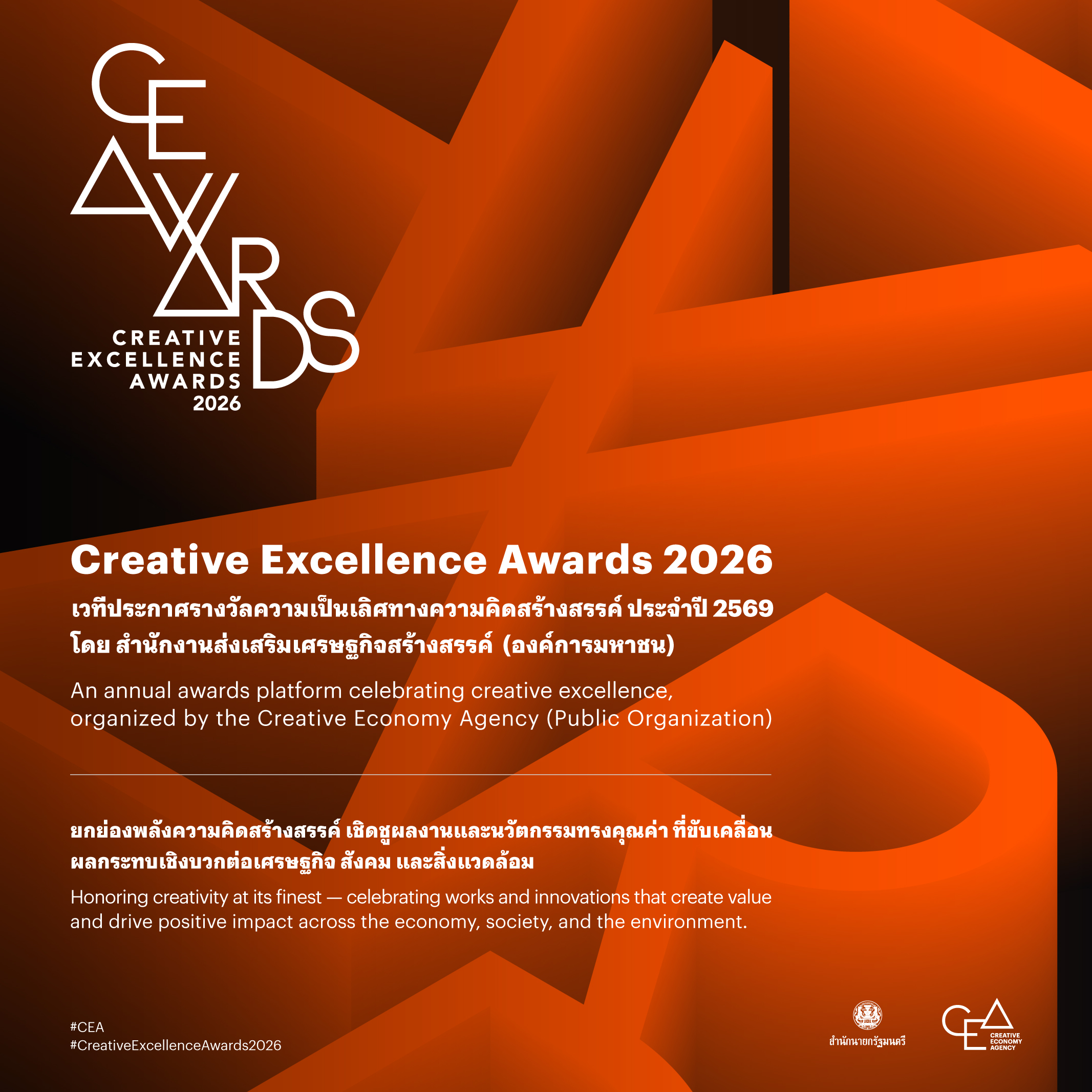 แนวคิดดังกล่าวนำาสู่การที่ CEA จัด การประกาศรางวัลความเป็นเลิศทางความคิดสร้างสรรค์ ประจำปี 2569 (Creative Excellence Awards 2026) เพื่อเชิดชูและยกย่องบุคคลหรือหน่วยงานที่มีผลงานโดดเด่นด้านความคิดสร้างสรรค์ พร้อมทั้งส่งเสริมให้เกิดการต่อยอดผลงานสู่การใช้งานจริงในวงกว้าง และสร้างแรงบันดาลใจให้แก่ภาคส่วนต่าง ๆ ในการขับเคลื่อนเศรษฐกิจสร้างสรรค์ โดยการประกาศรางวัลจะจัดขึ้นในเดือนสิงหาคม 2569