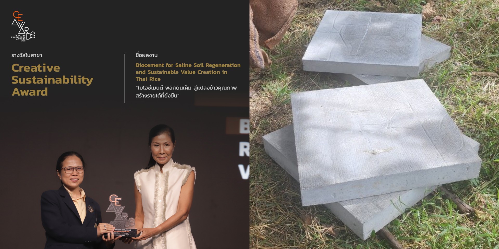 จากดินเค็มที่เคยไร้ค่า สู่นาข้าวคุณภาพสูง พลังฟื้นฟูของ “ไบโอซีเมนต์” คือนวัตกรรมสีเขียวจากกากหมักน้ำปลา เปลือกไข่ และหางแร่ ที่ผ่านกระบวนการจุลินทรีย์เร่งการตกตะกอนแคลไซต์ (MICP) จนได้วัสดุที่ทนการกัดกร่อนจากซัลเฟต ซ่อมรอยร้าวได้เอง และเพิ่มอินทรียวัตถุในดิน โดยได้ดำเนินโครงการนำร่อง 1 ปีในจังหวัดนครราชสีมาร่วมกับกลุ่มเกษตรกรท้องถิ่น และบูรณาการระบบติดตามผลผลิต คาร์บอนเครดิต และการประกันผลผลิต ผลลัพธ์ที่โดดเด่นคือข้าวมีสาร GABA สูงขึ้นกว่าเดิม 300 เท่า ค่าดัชนีน้ำตาลลดลง 30% และรายได้ของเกษตรกรเพิ่มขึ้น ไบโอซีเมนต์จึงไม่เพียงฟื้นฟูดิน แต่ยังเป็นต้นแบบในการสร้างคุณค่าอย่างยั่งยืน ภายใต้ BCG Economy ที่จะขับเคลื่อนอนาคตของประเทศไทย
