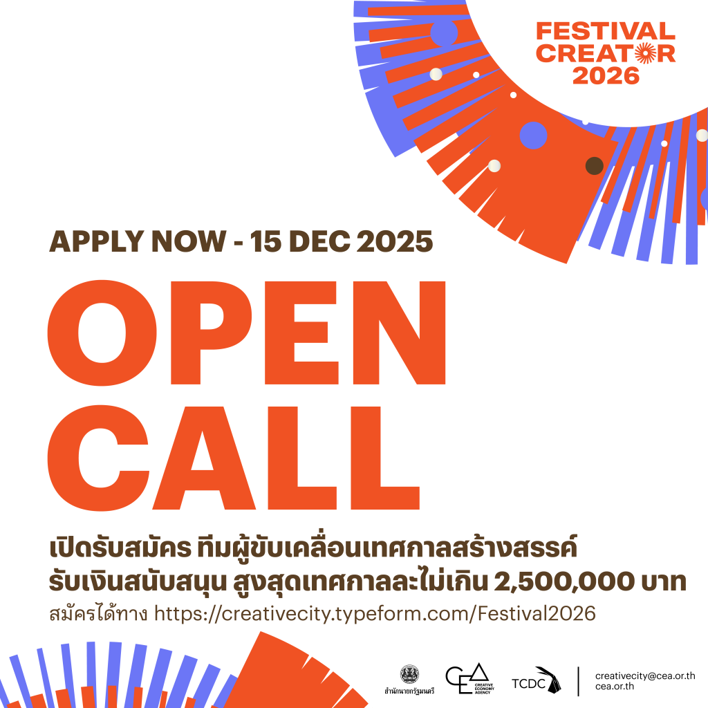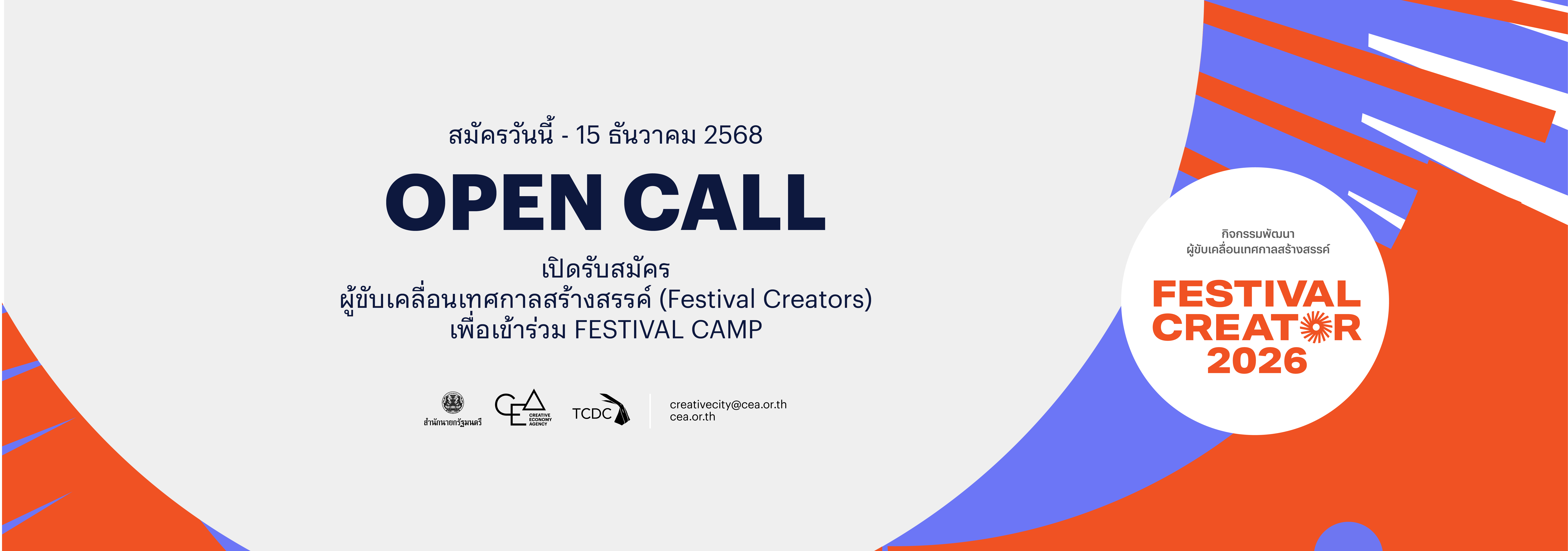 สำนักงานส่งเสริมเศรษฐกิจสร้างสรรค์ (องค์การมหาชน) หรือ CEA เปิดรับสมัครผู้ขับเคลื่อนเทศกาลสร้างสรรค์ เข้าร่วม FESTIVAL CREATOR 2026 กิจกรรมพัฒนาผู้ขับเคลื่อนเทศกาลสร้างสรรค์ ประจำปีงบประมาณ 2569 เพื่อยกระดับเทศกาลไทยให้เป็นเครื่องมือขับเคลื่อนเมืองและเศรษฐกิจสู่เวทีสากล พร้อมผลักดันอุตสาหกรรมเฟสติวัลไทยให้สามารถแข่งขันได้ในเวทีสากล สมัครได้ตั้งแต่วันนี้ - 15 ธันวาคม 2568