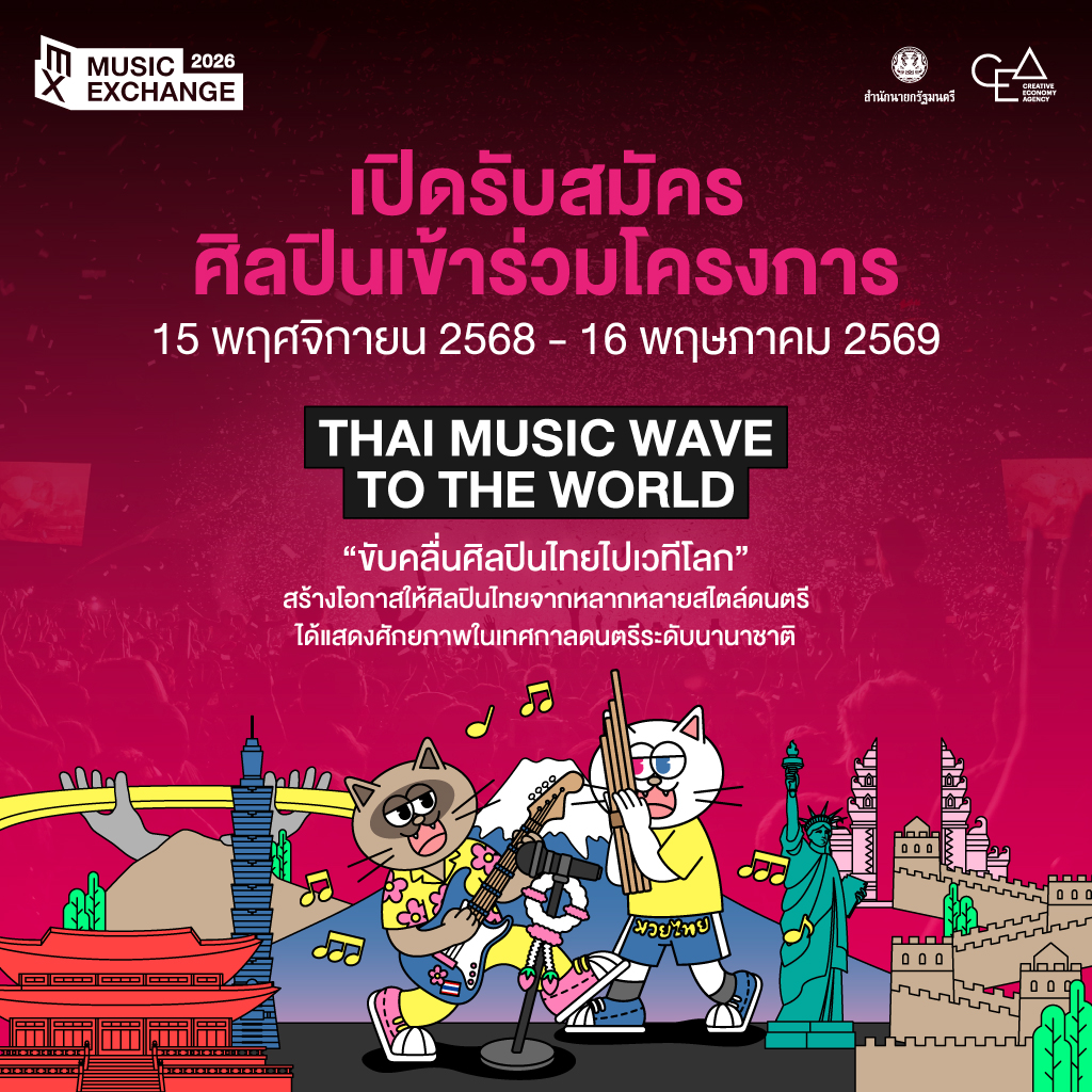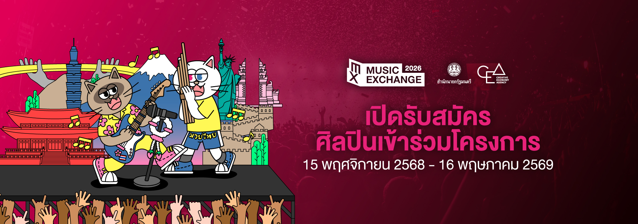 Music Exchange 2026 โครงการส่งเสริมการส่งออกสินค้าดนตรีสู่ต่างประเทศ ปี 2569 ที่จัดต่อเนื่องเป็นปีที่ 3 โดยสำนักงานส่งเสริมเศรษฐกิจสร้างสรรค์ (องค์การมหาชน) หรือ CEA เปิดรับสมัครศิลปินไทยเข้าร่วมโครงการระหว่างวันที่ 15 พฤศจิกายน 2568 - 16 พฤษภาคม 2569 โดย CEA จะคัดเลือกศิลปินที่มีศักยภาพ จำนวนประมาณ 40 ศิลปิน/การแสดง เพื่อรับทุนสนับสนุนค่าใช้จ่ายบางส่วนแบบเหมาจ่าย สำหรับการเดินทางไปแสดงในเทศกาลดนตรีระดับนานาชาติในต่างประเทศ โดยผู้สมัครจะต้องมีหลักฐานตอบรับการร่วมแสดง (Invitation Letter/Email) จากผู้จัดเทศกาลดนตรีนั้น ๆ และเทศกาลดังกล่าวจะต้องจัดขึ้นในต่างประเทศระหว่างเดือนมกราคม - กรกฎาคม 2569
